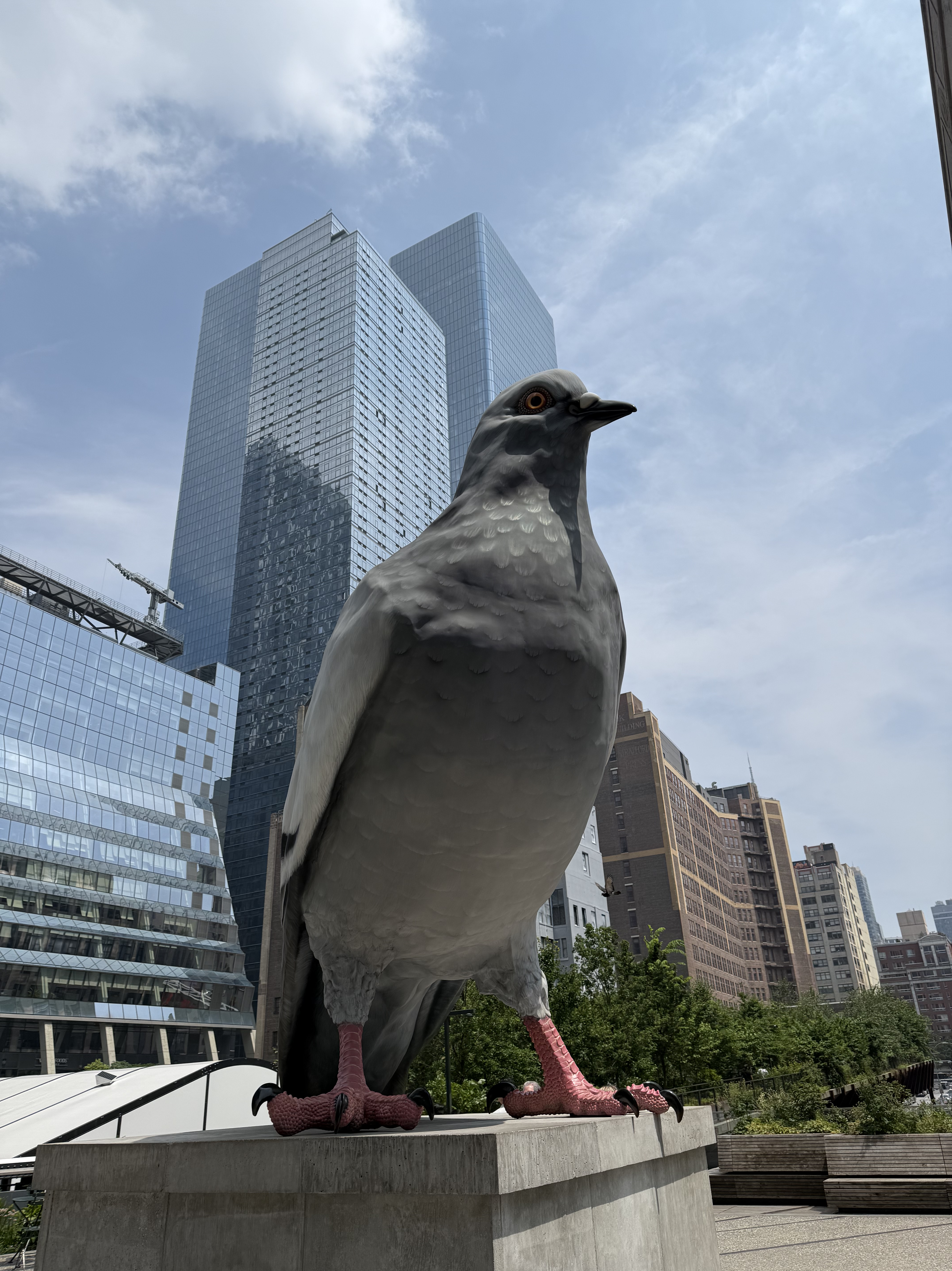 For architect fans, it runs alongside several unique buildings and offers views of the NYC skyline. The landscape is thoughtfully curated with signs highlighting the different plants. And, rotating artist installations can be found throughout, with the exhibit on The Spur being one of the most visible. When we visited The Spur was hosting a giant pigeon sculpture, titled, Dinosaur.